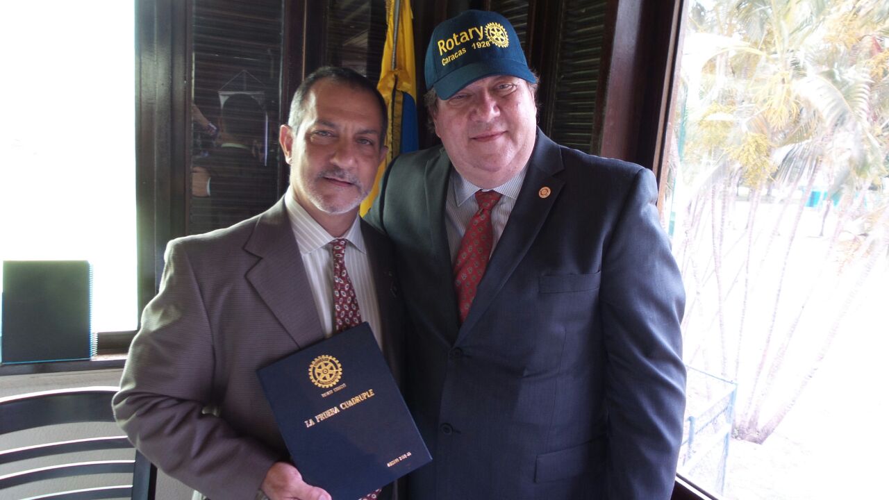 El macero siguiendo con la reunión le dio la palabra a Fernand Cival. Saludó y dijo estar muy contento de estar en Rotary Caracas el club de sus padres y donde se inició. “Hoy estamos en un club rotario nuevo en México donde estamos buscando la forma de hacer un proyecto en el que podamos incluir a Venezuela y a Rotary Caracas. En nuestro club es fácil hacer eventos para recoger fondos, pero tenemos que canalizar esos fondos en un proyecto que beneficie a los más necesitados”. Le dejo la palabra a Elenita que ha estado trabajando más con los proyectos posibles. Elenita explicó que están buscando atender niños en estado de abandono para darles posibilidades de mejor educación y alimentación. Hacer un proyecto sostenible y sustentable en el tiempo. Estaremos en contacto con ustedes para informarles. Gladys de Lanfranchi hizo entrega a Fernand de un anuario del año ILUMINEMOS ROTARY y a Elenita de un bonito botón rotario. Jorge Sleiman le entregó una gorra con el nombre de nuestro club. Y el presidente Robiro y Jorge le dieron encuadernados EL OBJETIVO DE ROTARY Y LA PRUEBA CUADRUPLE como obsequio de Rotary Caracas al club de México.